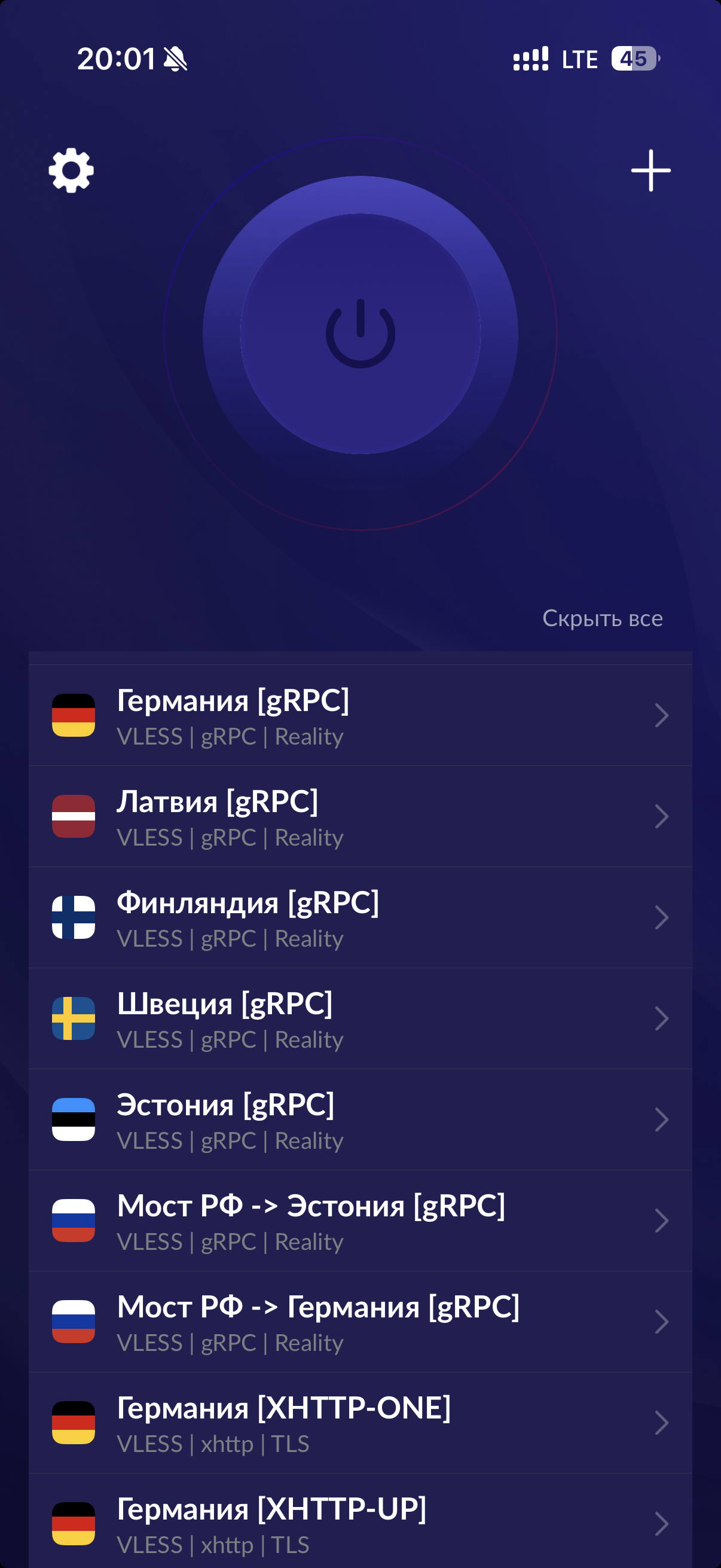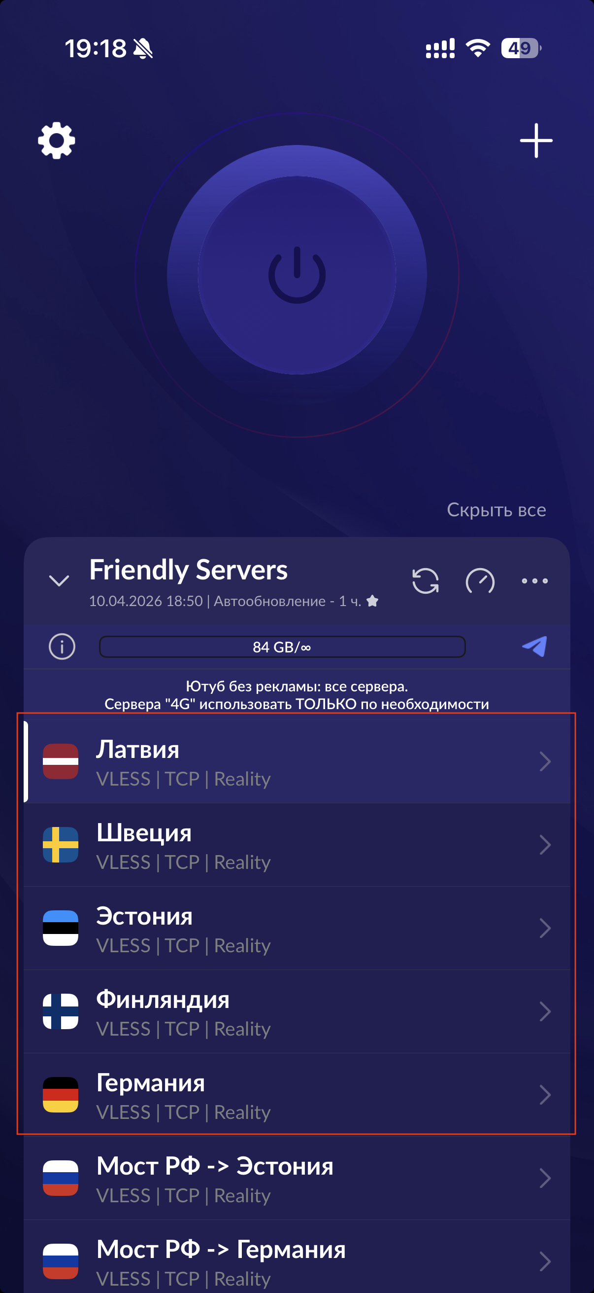 Всегда начинайте с серверов, где написано только название страны (например, Германия или Эстония). Без всяких скобочек и дополнительных слов.